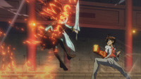 红绪在神威的帮助下浴火重生,对哥哥展开飞腿强攻,并完全压制了他。然而红绪的开挂状态还没持续多久,双腿就失去了战斗力,被悠斗吊打。关键时刻,轱辘挡在红绪身前,被悠斗击穿了胸膛。在双星的力量下,轱辘被快速治...